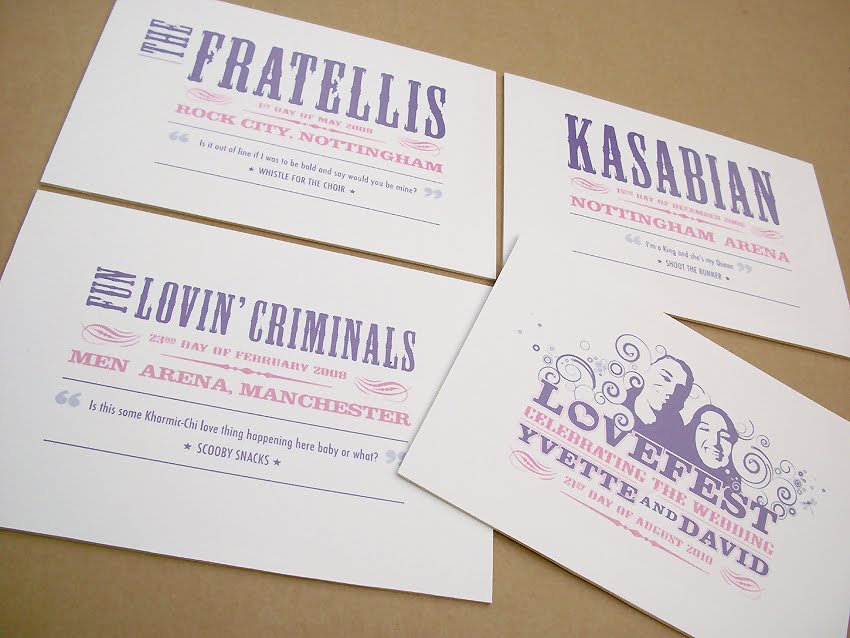 I was recently commissioned to design a special seating plan and table name cards for a couple who married this August. They tentatively contacted me about 6 weeks previously following recommendations of my work from happy brides on a wedding forum. Their brief was rough and fairly open to combine their love of music festivals, gigs they've shared together and to include photos and lyric quotes if possible.